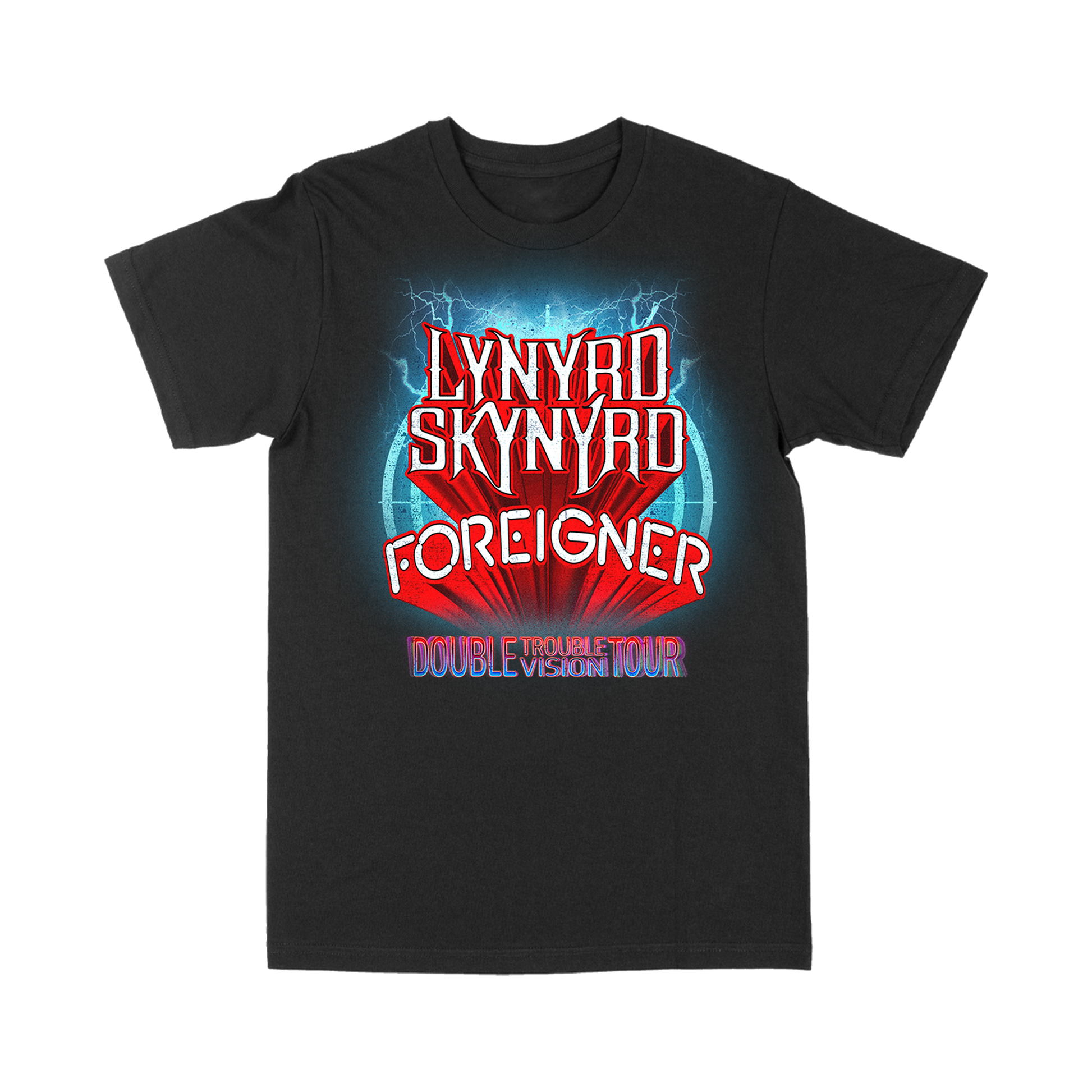 "Double Trouble Double Vision Tour" design printed on the front of a black 100% ring-spun cotton t-shirt with tour dates on the back.