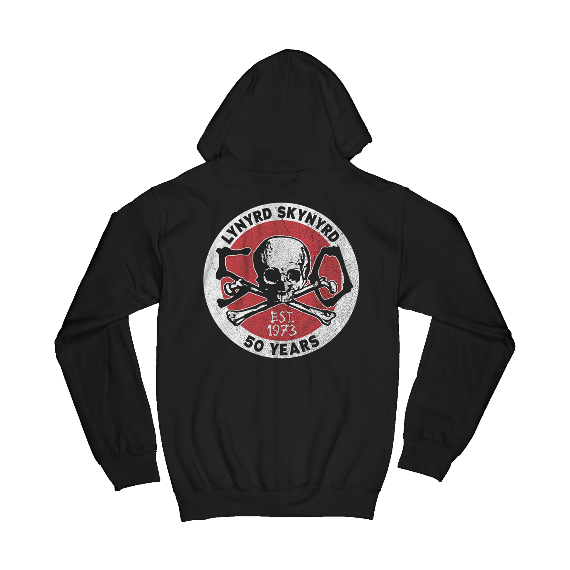 "50 Years" design printed on the back and the left pocket of a 70% cotton/30% polyester black hoodie with zipper.